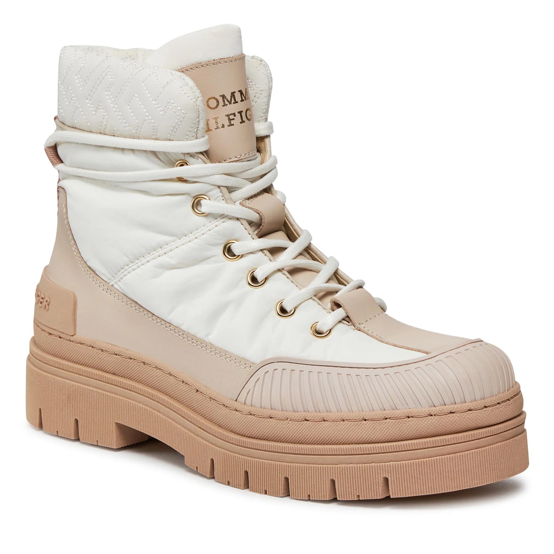 Γυναικεία αδιάβροχα μποτάκια σε λευκό μπέζ χρώμα , απο την συλλογή της εταιρείας TOMMY HILFIGER.Ελαφρύ και άνετο μποτάκι με αντιολισθιτική τρακτερωτή σόλα.