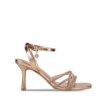 Ροζ χρυσό πέδιλο. Διαθέτει μαλακό μαξιλαράκι στη σόλα, λουράκια με διακοσμητικά στρας και ψηλό τακούνι. Δένει με ρυθμιζόμενο λουράκι αστραγάλου