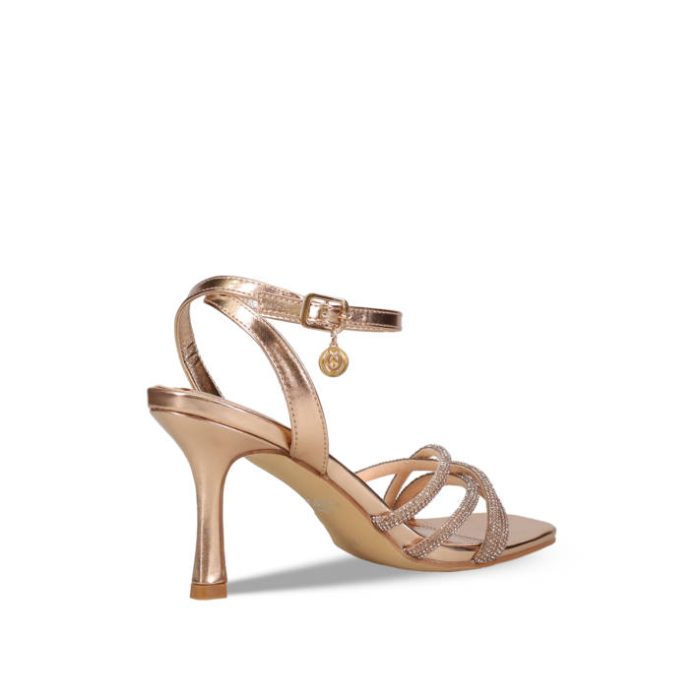 Ροζ χρυσό πέδιλο. Διαθέτει μαλακό μαξιλαράκι στη σόλα, λουράκια με διακοσμητικά στρας και ψηλό τακούνι. Δένει με ρυθμιζόμενο λουράκι αστραγάλου